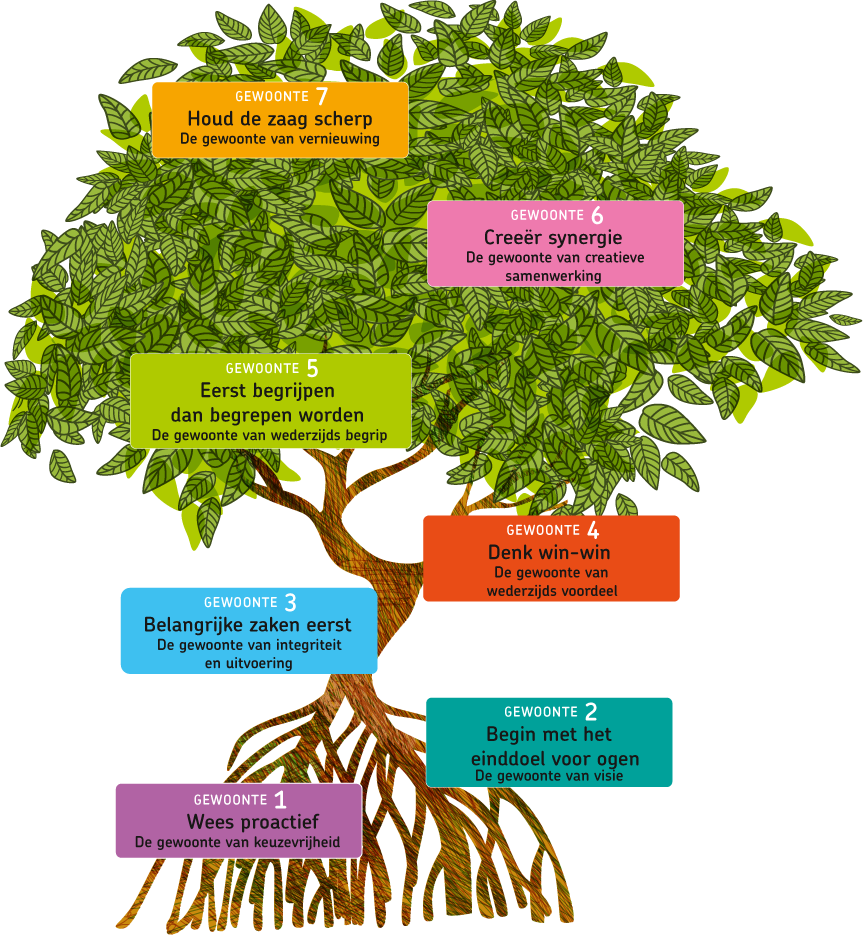 Het begint bij jezelf: de basis van de boom, de wortels (gewoonten 1, 2 en 3). Daarna komt het samenwerken en oog hebben voor de ander, zodat je samen meer bereikt: de stam en bladeren van de boom (gewoonten 4, 5 en 6). Tot slot is het belangrijk dat je goed voor jezelf zorgt: de zaag scherp houden, dat is de top van de boom (gewoonte 7).